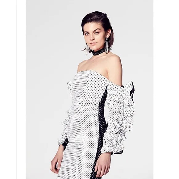 Contrast strapless fitted midi dress with ruffle sleeves. Fabrication of the dress is of a thick patterned brocade. Dress is fully lined and has an invisible back closure.